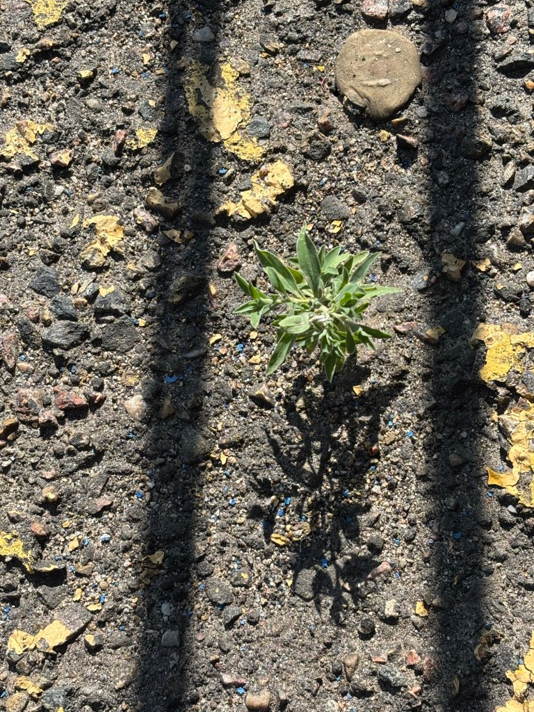 Most every Saturday I go to a 12-step meeting held in the center of Denver at the church I served for 18 years. I find my favorite parking space, which is in the shade which is sparse. About a month ago I noticed as I was getting out of the car, a weed growing in the pavement. My inclination was to pull it but I resisted. I admired its tenacity to “grow where it was planted”. Today there it was— slowly growing in an asphalt desert. SEE THE PICTURE ABOVE.