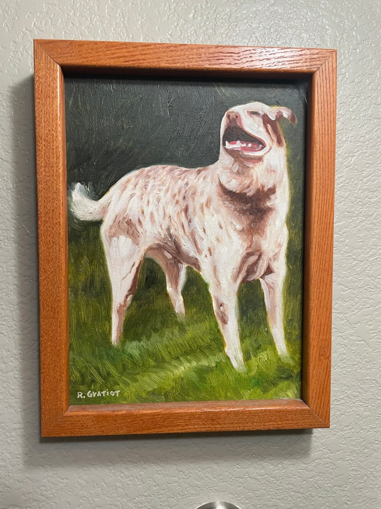 The painting of Smiley was done by our friend Robert G. I was amazed how he captured Smiley’s essence. This week at Washington Park I saw Smiley’s Australian Cattle Dog Doppelgänger— I had to restrain myself from being the nosey old guy stranger. So I took his picture with my heart.